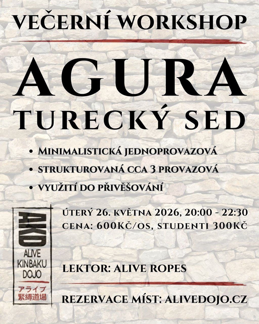 Na WS si ukážeme různé možnosti jak začít, jak pokračovat a jak improvizovat. Agura se i funkční do závěsu, dá uvázat pouze jedním provazem. My se však budeme věnovat variantě víceprovazové, pohodlné, bezpečnější a estetičtější.