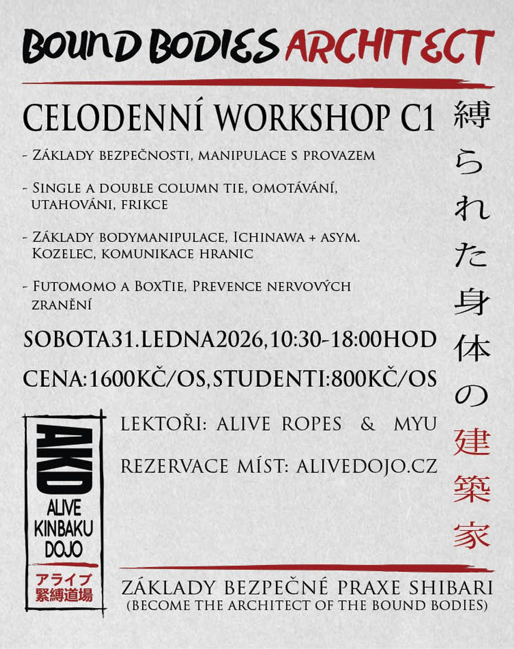 Kurz Bound Bodies Architect je primárně koncipován jako ucelená série, která nabízí začátečníkům absolvovat vše potřebné od základů až po závěsy, včetně prevence a bezpečnosti, bez nutnosti vyhledávat a kombinovat různé workshopy a přednášky a diskuse.