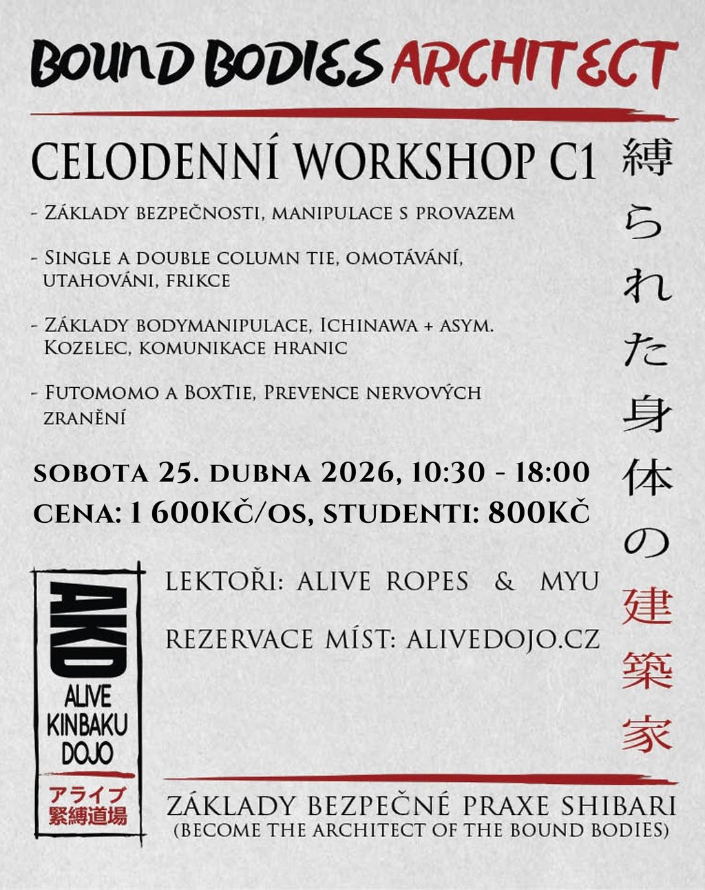 Kurz Bound Bodies Architect je primárně koncipován jako ucelená série, která nabízí začátečníkům absolvovat vše potřebné od základů až po závěsy, včetně prevence a bezpečnosti, bez nutnosti vyhledávat a kombinovat různé workshopy a přednášky a diskuse.