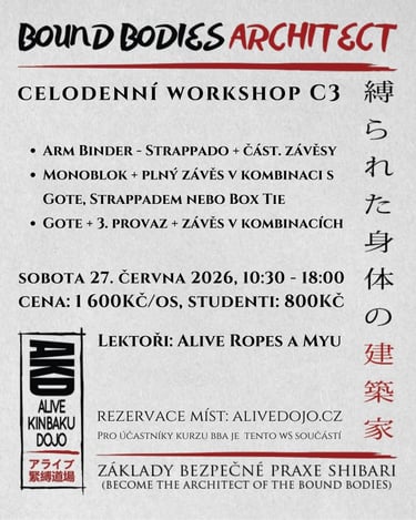 Kurz Bound Bodies Architect je primárně koncipován jako ucelená série, která nabízí začátečníkům absolvovat vše potřebné od základů až po závěsy, včetně prevence a bezpečnosti, bez nutnosti vyhledávat a kombinovat různé workshopy a přednášky a diskuse.