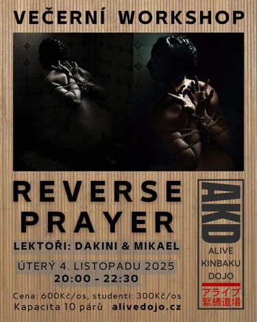 Tato pozice není pro každého. Pokud ruce modela/ky nelze bez provazů přirozeně dostat do reverse prayer polohy, účast pečlivě zvažte. Workshop má být výzvou, nikoli rizikem – respekt k tělu je na prvním místě.