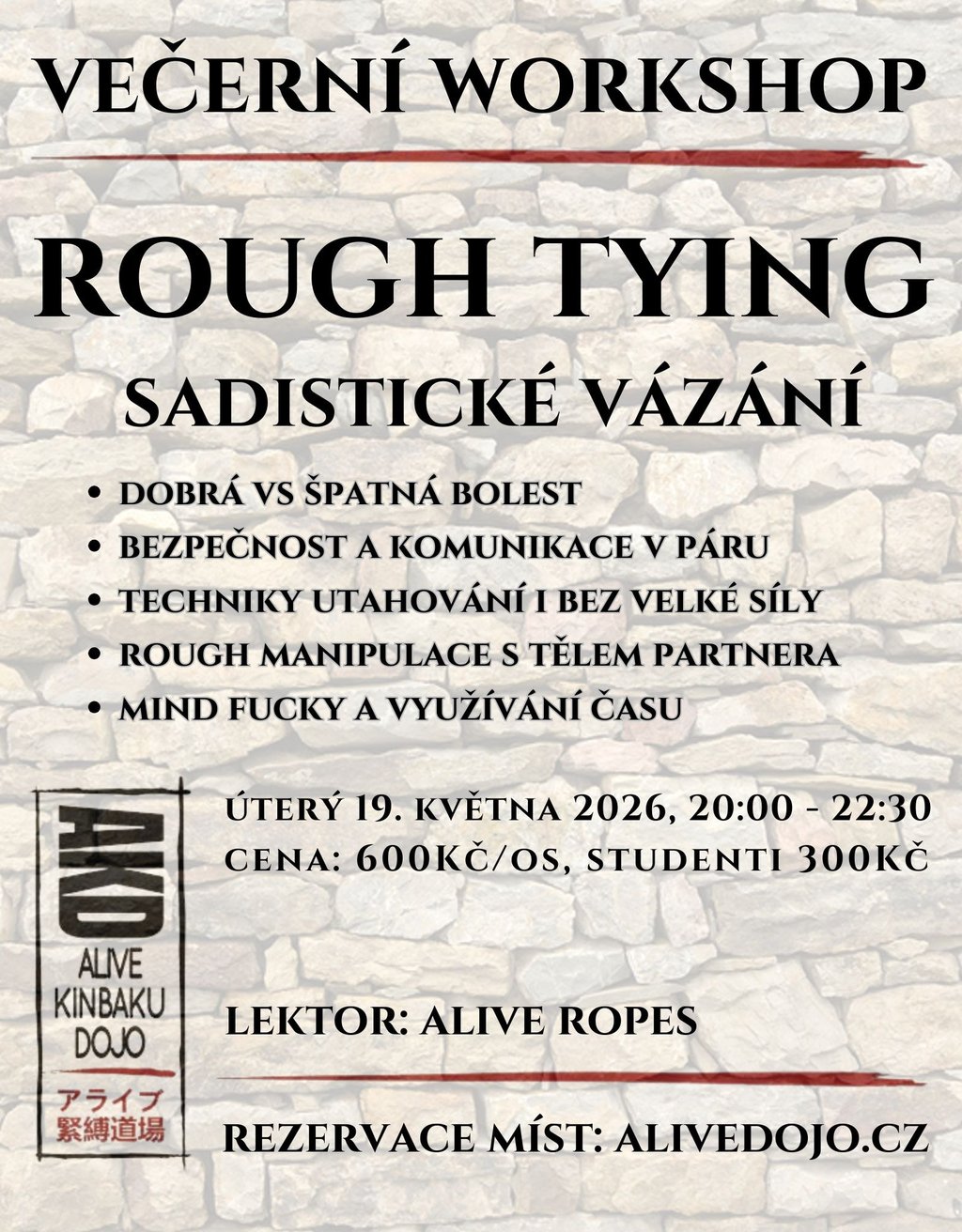 Úterý 19. května 2026, 20:00 - 22:30, 600Kč/os, studenti 300Kč/os