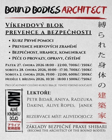 Kurz Bound Bodies Architect je primárně koncipován jako ucelená série, která nabízí začátečníkům absolvovat vše potřebné od základů až po závěsy, včetně prevence a bezpečnosti, bez nutnosti vyhledávat a kombinovat různé workshopy a přednášky a diskuse.