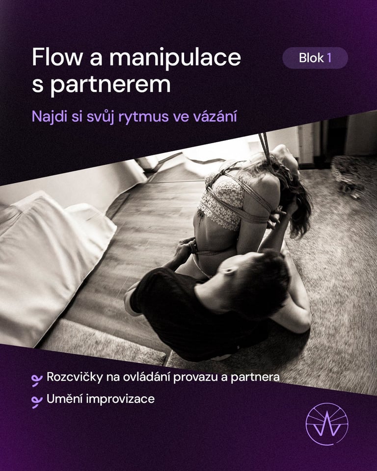 💜 Flow a manipulace s partnerem. Najdi si vlastní rytmus ve vázání. Rozcvičky na efektivní ovládání provazu a partnera, abyste se mohli co nejvíc věnovat emocím. Součástí je i umění improvizace.