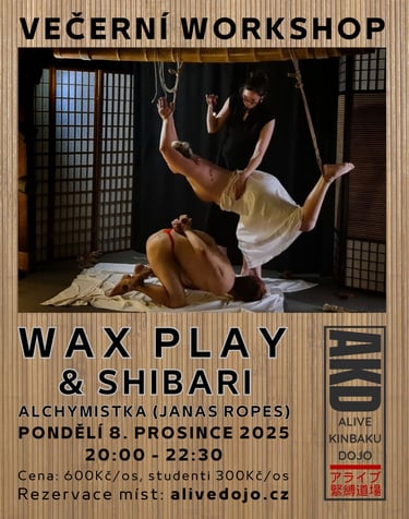 Objevte kouzlo waxplay - kapání horkého vosku na kůži, a zakomponujte ji do své shibari session. Workshop vás provede od základů waxplay přes hravé kombinace s provazy až po částečný/plný závěs pro ty odvážnější.