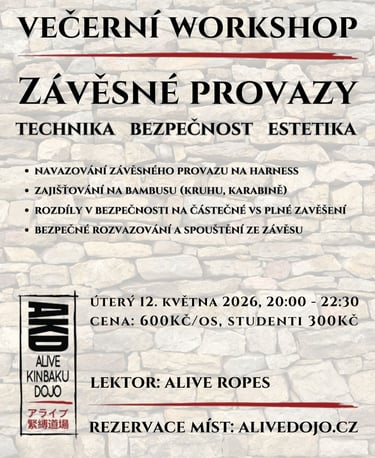 A nakonec přichází i zajištění provazu, kterým jdete nahoru přes bambus, zpět dolů a opět nahoru přes bambus. Taková technika se dá již bezpečně použít na závěs plný. Je však třeba trénovat a dostat vše tzv. do ruky. Vše umět zavázat rychle, s jistotou, správně technicky a pokud nám jde i o vizuální stránky, tak i esteticky.